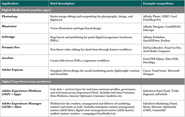 This is also not a deep dive into the history and nitty-gritty details of Adobe’s business segments and products, because that’s not where we think the alpha lies in the present environment. As such, for those who are unfamiliar with the company, we’ve enlisted ChatGPT to provide an overview of Adobe’s product suite and use cases.