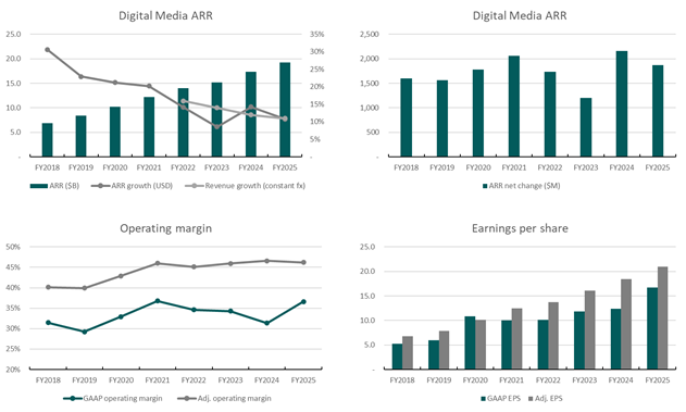 In seeking to answer these questions, we focus mainly on Adobe’s Digital Media segment, which consists of Adobe’s Creative Cloud suite of applications plus Acrobat and is central to the stock’s terminal value. We believe that any decision to own Adobe stock must be underpinned by the view that the Digital Media business is insulated from AI disruption, as the Digital Experience (DX) segment is very unlikely to offset a deterioration of the core creative business.