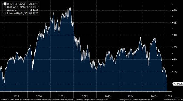 Towards the end of last year, we started sifting through what we thought was the rubble of the software sector looking for attractive opportunities. Software sector multiples as measured by the IGV had fallen to the lows of the 2022 bear market on fears that AI would “kill SaaS” for a multitude of reasons: some sensationalist (vibe coding replacements for systems of record) and some real (seat loss, margin compression and/or more competition). Evidently, we were still too early as the rubble has subsequently been nuked into glass.