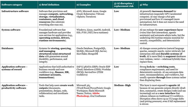 Before answering this question, let’s take a step back and briefly look at the broad categories of software that exist and what characterizes them as more or less susceptible to AI disruption. There is plenty of existing material on the Internet written about this topic and we are not trying to reinvent the wheel here, so we enlist ChatGPT again to provide a high-level overview.