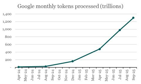 Consumer demand for AI remains robust. OpenAI reported 800 million weekly users in September, up from 500 million in March. Google just disclosed 650 million Gemini app MAU on its Q3 2025 call, up from 400 million at Google I/O in May. Over 2 billion monthly users benefit from AI Overviews, while the initial rollout of AI Mode reached 100 million users in July. Meta likewise has disclosed some big user numbers – over 1 billion Meta AI MAUs on its Q3 call.