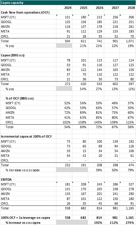 These hyperscalers have significantly more capacity to spend. If we compare current Bloomberg sellside consensus operating cash flows to capex for the five hyperscalers, we see that capex is “just” ~2/3rd of operating cash flow for the group. Only Oracle is currently, and is projected to continue, spending more than its cash flow on capex. If the group were to spend up to 100% of their operating cash flows on capex (i.e. free cash flow = zero), current sellside capex estimates would need to increase by as much as 50%. If these companies were to collectively lever up to 1x EBITDA to invest in AI, their capex spend would be 3x higher than current estimates!
