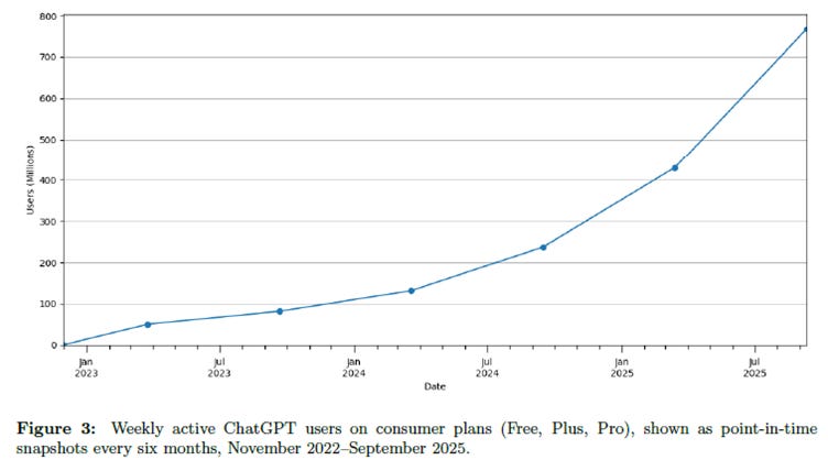 It’s been reported[5] that of ChatGPT’s 800 million WAUs, only 5%, or ~40 million, are paying users. Subscriptions account for 70% of OpenAI’s $13 billion ARR, with API access contributing the remainder. This basically says to us that the 800 million users, taken as a whole, find ChatGPT no more valuable than a freemium mobile game, where a single digit percentage of “whales” account for substantially all a game’s revenue.