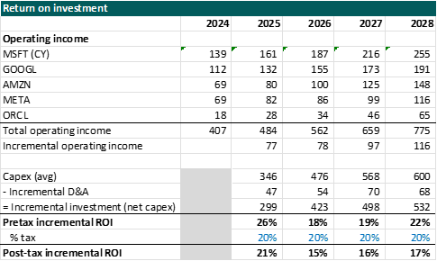 The simplest way we can think about ROI is to again look at sellside estimates. We know that the sellside capex forecasts broadly reflect the continuation of the current AI investment cycle (even though they tend to underestimate the capex). We strongly believe that, collectively, sellside are not explicitly modeling specific AI revenue streams for these hyperscalers. Rather, they are typically modelling company guidance and extrapolating growth rates into the future. As such, any AI monetization breakthroughs are not captured in sellside earnings estimates, while the capex burden is. Even so, we can see that the incremental ROI on the hyperscalers’ total capex is still expected to be decent, and certainly above their cost of capital (while returns for individual hyperscalers may vary).