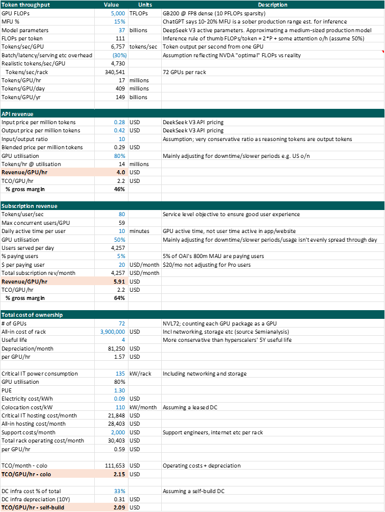 For the purposes of the analysis, we used DeepSeek V3 to approximate a medium-sized Mixture of Experts model that might be used in production. We also assume DeepSeek V3 API pricing, which is extremely low compared to the closed source frontier model pricing (e.g. GPT-5 is $1.25/$10.00 input/output and GPT-5 mini $0.25/$2.00). We haven’t found any reliable information on the sizes of the various GPT-5 models or which models are used for ChatGPT, so we’ve gone for the most conservative assumptions that generate the most conservative revenues.