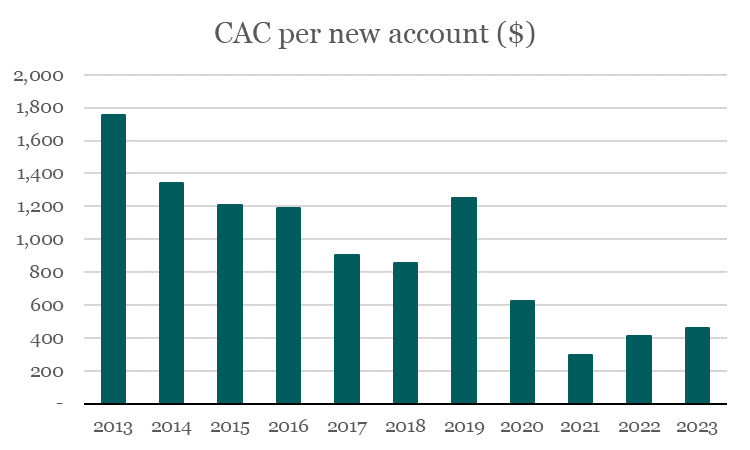 Even the customer acquisition engine – sales and marketing – has been largely automated. The company reported 2,951 employees in Q2 2024, of which only 1% are in sales. These 30-odd salespeople handle institutional prospects such as introducing brokers, hedge funds and investment advisors. Individual clients are mainly acquired through word of mouth and automated advertising channels. This has resulted in customer acquisition cost[8] per new account declining by over 70% over the past 10 years.