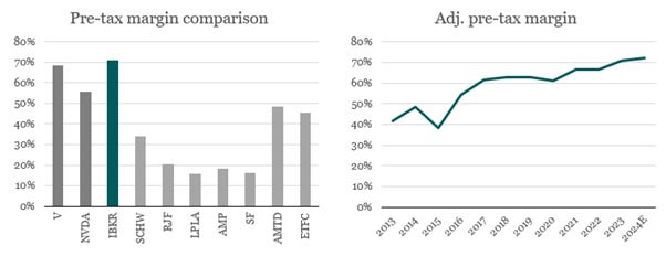 The corollary of this high level of automation across all aspects of the business is that IBKR operates with an extremely low cost structure. The company’s pre-tax margins are phenomenal – right up there with top S&P 500 margin earners such as Visa and Nvidia, and more than twice the margin of peers. While the company has arguably over-earned during the past two years due to the favorable interest rate environment (more on this later), a high 60s pre-tax margin in a more normalized interest rate environment is still indicative of a very high quality business. Quality of earnings is also high as adjustments predominantly relate to FX hedging and mark-to-market on investments.