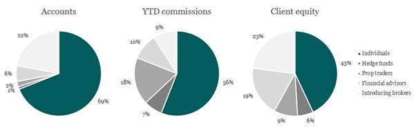 Hedge funds. IBKR offers prime brokerage services to hedge fund clients and is a particularly attractive broker for hedge funds with sub-$100 million assets. Hedge funds represent just 1% of client accounts but 6% of client equity and 7% of commissions.
